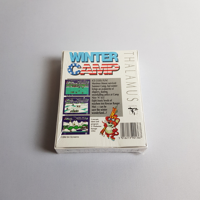 Ez a termék egy retro videójáték, a "Winter Camp", amelyet Commodore 64 számítógépre adtak ki. A C64 egy nagyon népszerű otthoni számítógép volt az 1980-as években és a korai 90-es években, amelyre számos játék jelent meg kazettás vagy lemezes formátumban. A képen látható csomagolás egy hordozható kazetta borítóját mutatja. A játék nevéből ("Winter Camp") és a borítóról levonható képekből arra lehet következtetni, hogy valószínűleg télies sportokkal vagy tevékenységekkel kapcsolatos kihívások sorozatát tartalmazza, mint például síelést vagy hódeszkázást. A borító grafikája és az azon szereplő figurák stílusa arra utal, hogy a játék könnyed, vicces hangvételű lehet, ahol a játékosságot humoros elemek is szórakoztatják. A "Kool and Slippery Fun" felirat a humoros és szórakoztató jellegre utal, valamint a téli sportokhoz kapcsolódó csúszós körülményekre. Ezenfelül egyértelműen látszik, hogy a kazetta kis méretű, tipikus a korabeli Commodore 64 játékokra jellemző formátumnak, és az, hogy 64K/128K Cassette felirat szerepel rajta, ami arra utal, hogy a játék mindkét Commodore 64 memória konfigurációval kompatibilis lehetett (64 kilobájttal és az 128 kilobájtos kibővített változattal egyaránt). Mivel a kép korlátozott információt nyújt, konkrét részlete [6.9]