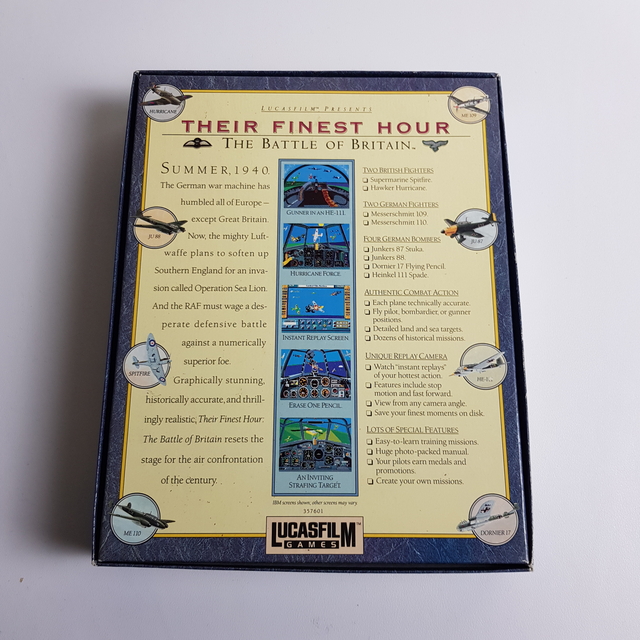 A képeken látható termék egy régebbi számítógépes játék, amely a "Their Finest Hour: The Battle of Britain" címet viseli. Ez a játék a Lucasfilm Games (ma ismertebb néven LucasArts) által kifejlesztett és kiadott egyik hadtörténelmi repülő szimulátor, mely a második világháború egy jelentős eseményére, a Britanniáért folyó csatára (Battle of Britain) koncentrál. A képekről több információt is megtudhatunk: 1. A doboz tetején egy időszakos design van látható, valamint a Lucasfilm Games logója és arra hivatkozás, hogy a játék az Amiga 500, 1000, 2000 számítógépekre elérhető, ami arra utal, hogy a termék a '80-as vagy a '90-es évek elejére datálható. 2. A doboz tartalma között található egy referencia kártya, amely valószínűleg segítséget nyújt a játék kezeléséhez és az irányításához, a játékműveletek megértéséhez. 3. Egy tárcsát is láthatunk a dobozban, ami valószínűleg a játékhoz tartozik, és valamilyen módon beépülhet a játékmenetbe vagy annak irányításába. 4. A játék grafikai stílusa és a dobozon lévő képek arra utalnak, hogy a játék a repülőgépek és légi csaták valósághű ábrázolására törekszik, és a játékosok élesíthetik pilóta készségeiket a második világháború idején. A [8.8]