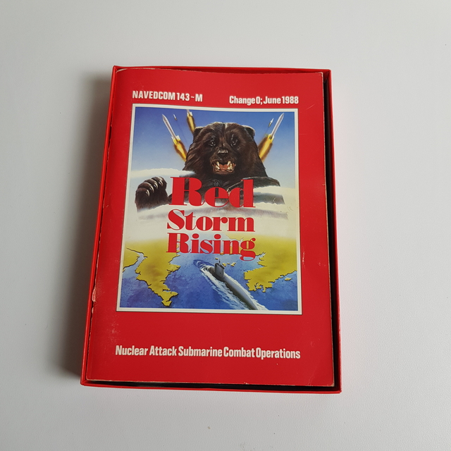 A képeken a "Red Storm Rising" című számítógépes játék látható a Commodore 64 számítógépre. Ez egy nukleáris tengeralattjáró-szimulációs játék, amely a hidegháború kontextusában játszódik, és a neves amerikai író, Tom Clancy regénye alapján készült. A borítón egy tengeralattjáró között egy medvefej jelenik meg, mely valószínűleg az Oroszországot szimbolizáló medve motívumára utal, utalva a Szovjetunióval szembeni konfliktusra, amely a játék középpontjában áll. A csomag tartalmazza a játék floppy lemezét, valamint a használati útmutatót és egy technikai kiegészítő útmutatót, amely extra információt és utasításokat biztosít a játékhoz. A játék 1988-as kiadású, amint az a dokumentumok egyikén látható dátum is jelzi. A játék fejlesztője az MicroProse, egy neves játékfejlesztő cég volt a 80-as és 90-es években, amely különösen ismert volt repülő- és hadászati szimulációs játékai miatt. Ez a játék egyaránt kihívást, valamint stratégiai és taktikai döntéseket igényel a játékostól, akinek a szovjet fenyegetéssel szembenézve kell vezetnie a NATO tengeralattjáró flottáját. [8.8]