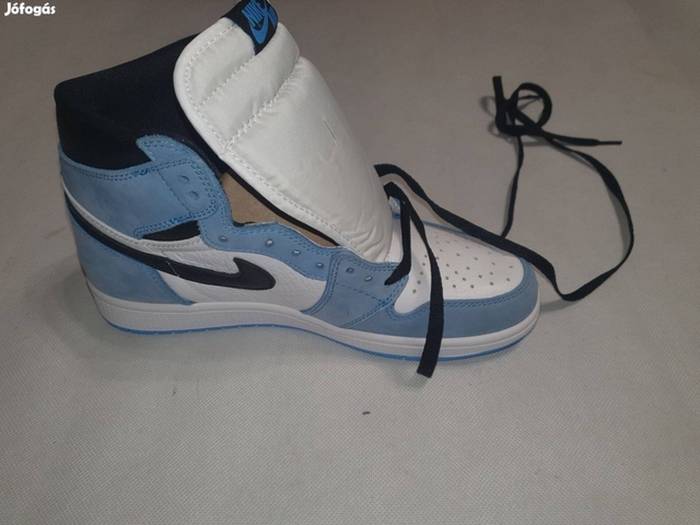A képeken egy pár Nike Air Jordan 1 sportcipőt látunk. Ezek a cipők különösen népszerűek a kosárlabdázók és a sneakerrajongók körében. Az alábbi információkat tudjuk elmondani a termékről: 1. **Márka és Modell**: Nike Air Jordan 1. 2. **Színkombináció**: Világoskék, fehér és fekete színű. 3. **Méret**: A címke szerint az amerikai méret 7 (US 7), ami megegyezik a brit méret 6-tal (UK 6), az európai méret 40-nel (EUR 40), illetve a kínai méret 250-nel (CN 250). 4. **Gyártási hely**: Kínában készült (Made in China). 5. **További jellemzők**: A cipő címkéjén található egy QR-kód és a UPC-kód, amely segíti a termék azonosítását. 6. **Extra felszerelés**: Úgy tűnik, hogy a cipővel együtt egy extra pár világoskék cipőfűző is tartozik. A Nike és az Air Jordan márkák köztudottan magas minőségű és divatos lábbeliket kínálnak, amelyek nemcsak sportolásra, de mindennapi viseletre is alkalmasak. [7.5]