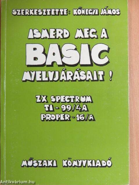 A képen látható termék egy könyv, amelynek címe "Ismerd meg a BASIC nyelvjárásait!" És a szerzője "Kőneci János". A könyv a BASIC programozási nyelv különféle változatairól szól, és konkrétan a ZX Spectrum, TI-99/4A, és a Proper-16/A változatokat tárgyalja. Kiadója a Műszaki Könyvkiadó. A könyv valószínűleg a számítógépes programozás iránt érdeklődők számára készült, és segíthet a BASIC nyelv alapjainak elsajátításában és a különféle változatok közötti különbségek megértésében. [1.2]