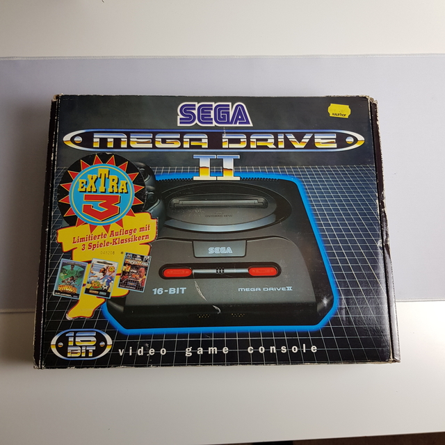 A képeken egy SEGA Mega Drive II konzol látható eredeti dobozában. A doboz elején központi helyet kapott a konzol képe, amely mellett feltűnően látszik a "16-BIT" felirat, kiemelve a rendszer technikai specifikációját. A doboz bal oldalán egy sárga matrica jelzi, hogy ez egy korlátozott kiadású csomag, amely három extra játékot tartalmaz, amit három színes játékkép is illusztrál. Az előlap bal felső részén a SEGA logó kék betűkkel szerepel, alatta pedig a "Mega Drive II" logó található futurisztikus betűtípussal. A doboz hátulján többnyelvű leírás olvasható a konzol tulajdonságairól és képességeiről, így a termék nemzetközi piacra is alkalmas. A hátlap felső részén szintén megjelenik a SEGA Mega Drive II logó. A központi képen újra látható a konzol, alatta egy rövid összefoglaló ismerteti a konzol különlegességeit, többek között a 16 bites grafikai teljesítményét és a rendkívül széles játékkínálatát. A jobb oldalon számos játék borítóját láthatjuk, ilusztrálva a konzolhoz elérhető szoftverek sokszínűségét és minőségét. A doboz általános megjelenése retró hangulatot kelt a fekete, kék és lila színek alkalmazásával, ami egyértelműen a '90-es évek stílusát idézi. A csomagolás célja nemcsak a konzol védelme, hanem a termék vonzó bemutatása is, különösen a limitált kiadás kínálta extra értékek kiemelésével. A SEGA Mega Drive II konzol ezen kiadása ideális választás lehet azok számára, akik nosztalgiát éreznek a klasszikus video játékok iránt, és érté [3.2]