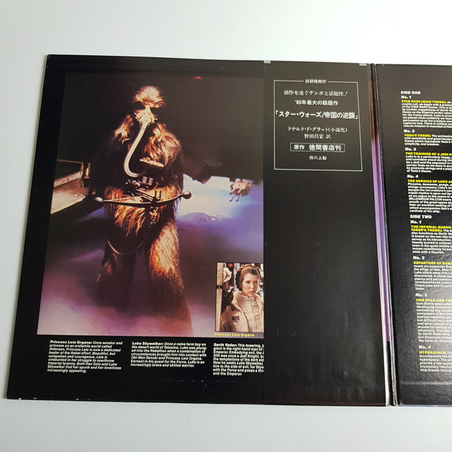 A képeken egy "The Empire Strikes Back" (a Csillagok Háborúja sorozat második filmje, amelyet eredetileg 1980-ban mutattak be) filmzenei albumának bakelitlemeze látható. A felvételek John Williams által komponált és vezényelt, aki ezért igen ismert és tiszteletnek örvendő zeneszerző és karmester a filmmuzsika világában. A második kép a hátsó borítót mutatja, ahol az album dallistája és a készítők nevei szerepelnek. A harmadik kép az album elejét jelenti, amelyen Darth Vader karaktere látható egy űrhajón keresztül a csillagháborús univerzum egy jellegzetes csillaghadjáratával a háttérben. A negyedik kép a hátulját mutatja az albumborítónak, ahol egy művészi ábrázolás látható a film főszereplőiről és díszleteiről. Mindezek alapján a termék egy japán kiadású filmzenei bakelitlemez, gyűjtőknek és rajongóknak szánt kiadvány. Az album a Csillagok Háborúja-saga egyik kulcsfontosságú darabjának zenéjét örökíti meg, mely ikonikus darabjai a filmművészethez és a popkultúrához. [7.0]