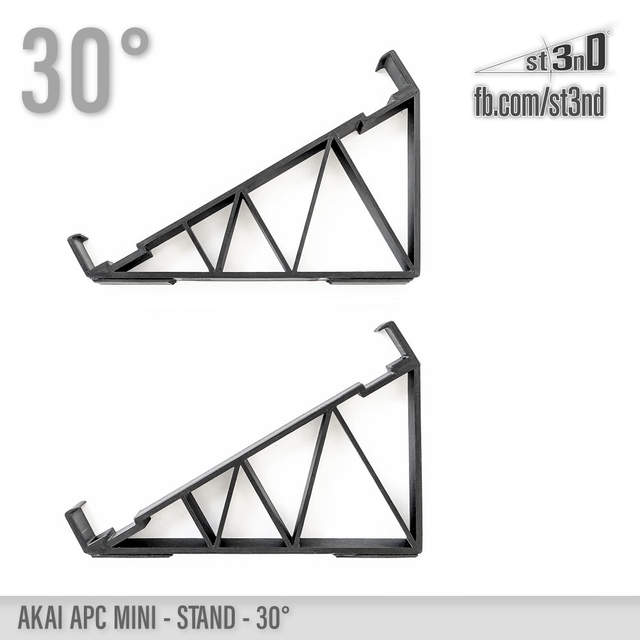 A képen egy "AKAI APC MINI - STAND - 30°" felirattal ellátott termék látható, ami egy állvány az Akai APC Mini MIDI vezérlő számára. Elsősorban zenei alkalmazásokhoz használják, és az állvány célja, hogy ergonómikusabb szöget biztosítson a MIDI vezérlő kezeléséhez, amikor asztalon helyezkedik el. A 30° utal az állvány által biztosított szög nagyságára, ami azt jelenti, hogy a MIDI vezérlő ennek megfelelően döntött pozíciót vesz fel rajta. A termék designja minimalistikus, geometrikus mintázatokat használ, amely nemcsak esztétikai célból van, hanem a tartósság és stabilitás növelése érdekében is. Az Akai APC (Ableton Performance Controller) sorozat arra tervezett MIDI vezérlők, amelyeket különösen az Ableton Live zenei produkciós szoftverrel való használatra optimalizáltak, de más digitális audio munkaállomásokkal (DAW-kkal) is kompatibilisek. Az APC Mini egy kisméretű, hordozható vezérlő, amely padokat, gombokat és fadereket tartalmaz a zenei előadások és keverések könnyebb kezelhetőségéhez. [5.0]