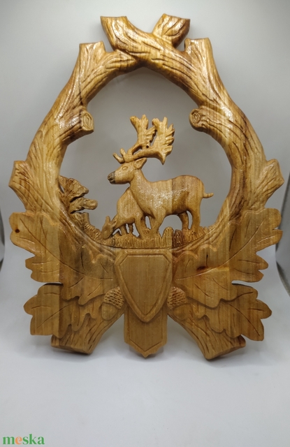 A képen egy fafaragás látható, ami valószínűleg egy díszítő elem vagy falikép. A faragás egy erdei jelenetet ábrázol egy szarvast, leveleket és ágakat formázva, amelyek egy ovális keretbe vannak foglalva. A mű keretének tetején egy kiemelkedő korona vagy díszelem látható, ami a természet és a vadászat jelképeként szolgálhat. A faragás részletes kidolgozású, látszik, hogy jelentős kézművességet és bonyolult mintázatokat igényelt a készítése. Az ilyen jellegű faragásokat gyakran rendelik meg egyedi díszítőelemként, adott esetben vadászati témájú helyiségekbe, hotelekbe, vendéglátóhelyekre, vagy akár otthoni dekorációként is. Az anyaga valószínűleg fa, talán valamilyen keményfa, ami jól bírja a részletes faragást és időtálló. [4.1]