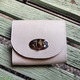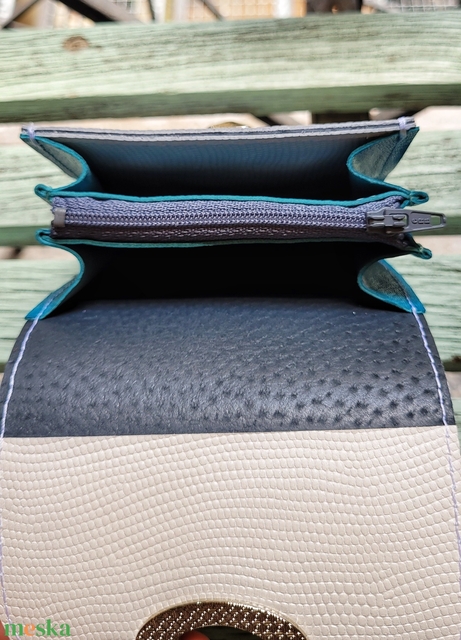 A képeken egy női pénztárca látható. A pénztárca több rekeszes kialakítást mutat, ami praktikus a különböző bankjegyek, aprópénz és kártyák rendezett tárolásához. A felső képen a pénztárca belseje látható, amelyben legalább két nagyobb rekesz és egy középső, cipzárral záródó kisebb rekesz van, valószínűleg az aprópénz számára. A második képen a pénztárca kívülről látható, zárt állapotban. A tárgy világos színű, texturált (valószínűleg mesterséges vagy valódi bőr hatású) anyagból készült, és egy fémes, arany színű záróelemmel rendelkezik a fedelén. A design elegáns és modern, alkalmas lehet mindennapi használatra vagy akár elegánsabb alkalmakra is. A fotókon látható márkanév ("meska") alapján valószínűsíthető, hogy a termék kézműves módszerekkel készült, vagy egy kisebb vállalkozás terméke lehet, de a képek alapján további konkrét információt nem tudunk megadni a gyártóról vagy a márka hátteréről. [5.5]