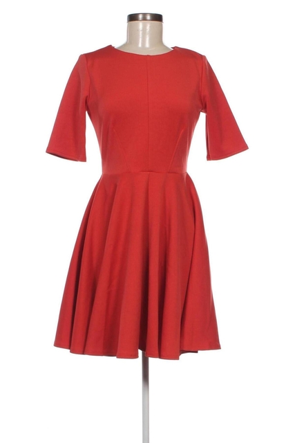 A képen egy piros női ruha látható. A ruha dizájnja egyszerű, klasszikus vonalvezetésű, ami a következőket jelenti: - A ruha felső része felszabott, rövid karú, mintegy félkarú kivitelben, ami átmenetet képez lehet az alkalmi és a mindennapi viselet között. - A derékrészen enyhe bevágás vagy derékpánt látható, ami kiemeli a viselője alakját és ráncolás nélkül transzformálja a ruha sziluettjét. - A szoknya rész enyhe A-vonalú vagy bővülő kialakítású, ami előnyös lehet különböző testalkatokon, hiszen a hangsúlyozott derékkal kombinálva szépen kihangsúlyozza a csípőt. - Az anyaga sima, egyszínű, ami alapján nehezen mondható meg, hogy pontosan milyen anyagból készült, de az esés alapján valamilyen tömör, de könnyű anyagra utalhat, mint például pamutkeverék, poliészter vagy hasonló. A ruha olyan választás lehet, ami alkalmas lehet különféle alkalmakra, attól függően, hogy milyen kiegészítőkkel párosítják. Viselhető mindennapi munkahelyi környezetben, de megfelelő cipővel és ékszerekkel elegánsabb eseményeken is megállja a helyét. [5.5]