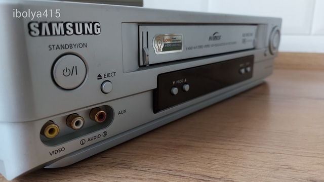 A képeken egy Samsung márkájú VHS videómagnó látható, ami egy régebbi típusú elektromos eszköz, amelyet a videokazetták lejátszására és felvételére használtak. Az ilyen típusú eszközök a 70-es, 80-as és a 90-es években voltak nagyon népszerűek, és ez volt az otthoni videofelvétel és filmnézés standard eszköze, mielőtt a DVD és később a Blu-ray formátumok átvették a vezető szerepet. Ez a konkrét modell több jellemzőt és csatlakozó lehetőséget kínál: - AV bemenet (Audio/Video input) az elülső oldalon, ami lehetővé teszi külső eszközök, például egy kamera vagy egy másik videólejátszó csatlakoztatását. - A hátulján további csatlakoztatási opciók vannak, többek között egy antennacsatlakozó (RF In/Out), videokimenet és más audio/videó bemenetek és kimenetek. - Van egy távirányító is, amely segítségével a felhasználó távolról irányíthatja a videómagnót. - Előlapon több vezérlőgomb található (pl. EJECT, STOP, PLAY stb.), valamint egy LED kijelző, ami az aktuális állapotot mutatja (pl. Play, Rewind stb.) A VHS a "Video Home System" rövidítése, és a 2000-es évek közepére alapvetően elavulttá vált, mivel a digitális formátumok egyre népszerűbbé váltak. Azonban még ma is vannak filmgyűjtők és nosztalgia kedvelők [8.2]