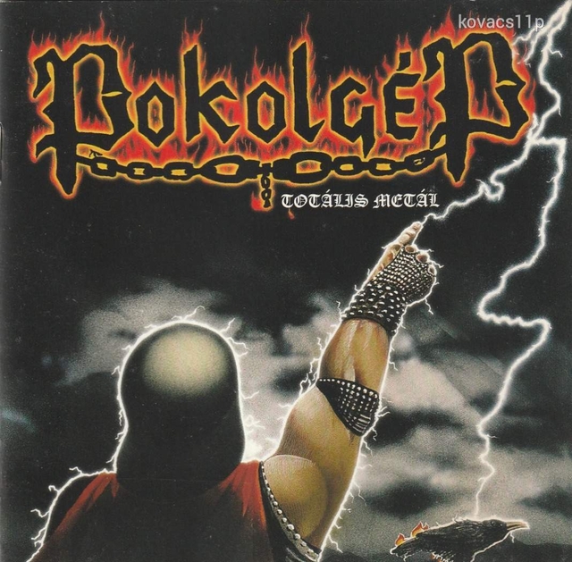 Ez a két kép egy zenei album borítója. Az album címe "Pokolgép", amely egy magyar heavy metal együttes neve is egyben, és az album alcíme "Totális Metal". A képekből ítélve ez egy zenei CD vagy esetleg bakelitlemez. Az első képen az együttes logója és egy karakter látható, aki egy villámkörnyezetben áll, ami a heavy metal zenére jellemző vizuális elem. A második képen az album hátlapja látható, a számlista és az együttes egyik koncertjének fotóval, így egyértelműen zenei tartalomra utal. A vonalkód, katalógusszám és a kiadó információk alapján egy hivatalosan kiadott terméket látunk. [3.8]