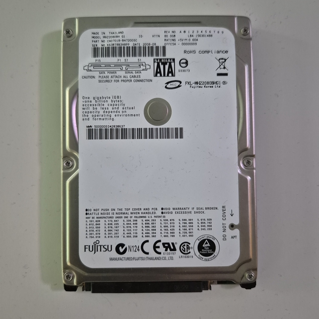 Ez a Fujitsu márkájú merevlemez egy 2,5 hüvelykes belső HDD, amit hordozható eszközök, például laptopok tárolási igényeit szem előtt tartva terveztek. A termék jellegzetességei közé tartozik a 160 GB kapacitás, mely elegendő tárhelyet biztosít különböző fájlok, dokumentumok, multimédiás tartalmak és szoftverek tárolására. A merevlemez egy SATA csatlakozófelületen keresztül kapcsolódik, ami gyors adatátvitelt és megbízható teljesítményt nyújt. Az eszköz a Fujitsu és a RoHS megfelelőségi szabványait is teljesíti, így garantálva a környezetbarát és fenntartható technológiai megoldást. Az egyik oldalon találhatók a technikai adatok, mint például a modell száma (MHZ2160BH), a sorozatszám és a gyártási hely (Thaiföld). A címkén figyelmeztetések is olvashatók a megfelelő kezeléssel és beszereléssel kapcsolatban, amely biztosítja a készülék hosszú élettartamát és megbízhatóságát. A másik oldalon látható az áramkör, amely precíz és gondos kialakítást tükröz, valamint a különböző technikai specifikációk, amelyek magabiztos teljesítményt nyújtanak a felhasználók számára. A merevlemez által alkalmazott modern technológiai megoldások a megbízható működést és az adatok biztonságát is garantálják. [2.6]