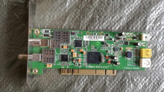 Ez a termék egy PCI interfésszel rendelkező tuner kártya, amely különböző belső komponenseivel és csatlakozóival hívja fel a figyelmet. A kártya zöld nyomtatott áramköri lapján több integrált áramkör, kondenzátor, ellenállás és egyéb elektronikai komponens helyezkedik el, amelyek összegyűjtve biztosítják a készülék megfelelő működését. Két fémborítású légésző csatlakozó található a bal oldalon, valószínűleg koaxiális kábel csatlakoztatására használhatók. A kártya jobb oldalán több különböző típusú csatlakozó található, köztük egy sárga, egy fehér és egy fekete, amelyek további bővítőmodulok vagy külső eszközök csatlakoztatását szolgálják. A nyomtatott áramköri lap alján található aranyozott csatlakozó lábak segítségével a kártya könnyen illeszthető az alaplap PCI foglalatába. A kártyán több helyen is megtalálhatóak feliratok és sorozatszámok, amelyek azonosítják a terméket, beleértve a gyártói jelzést és a szabványoknak való megfelelést igazoló jelzéseket is. A kártya tervezéséből és kialakításából adódóan valószínűleg televíziós jelek vételére készült, lehetővé téve a felhasználóknak, hogy számítógépükön tévét nézzenek. Az összekapcsolt elektronikus komponensek és csatlakozók biztosítják a kiváló jelminőséget és a megbízható működést. [2.7]