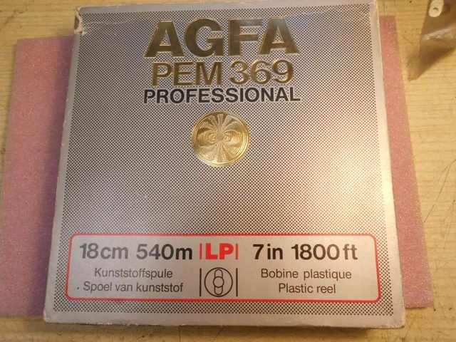 A képen egy doboz látható, amely az AGFA PEM 369 PROFESSIONAL típusú magnetofon szalagot tartalmazza. A doboz színe ezüstös, amely a professzionális minőséget sugallja, és a felületén apró mintázattal van ellátva, amely kiemeli a termék elegáns megjelenését. A középső részen nagy, vastag betűkkel van feltüntetve az AGFA márkanév, alatta a PEM 369 PROFESSIONAL típusjelzés található, ez pedig a szalag professzionális felhasználására és magas minőségére utal. Egy arany színű embléma díszíti a doboz közepét, amely tovább növeli a prémium érzést. Az alsó szakaszon találhatók a termék legfontosabb specifikációi: a szalag hossza 18 cm, ami körülbelül 540 méter vagy 1800 láb. Az LLPI jelölés a szalag technikai jellemzőire utalhat. A dobozból kiderül, hogy a szalag egy műanyag orsóra van feltekerve, amely praktikus és könnyen kezelhető. Az alsó részen németül, angolul és franciául is szerepel az információ: „Kunststoffspule” vagyis „műanyag orsó”, „plastic reel” az angol megfelelője és „bobine plastique” a francia változata ennek a kifejezésnek. Az információ több nyelven történő feltüntetése azt jelzi, hogy a termék nemzetközi piacra készült. Összességében a leírás alapján ez a termék minőségi magnetofon szalag, amely különösen alkalmas professzionális felhasználásra, és multinacionális vásárlók számára is vonzó választás lehet. [2.7]