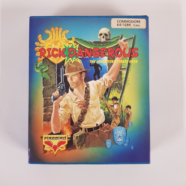 Ez a "Rick Dangerous" című játék doboza, amely Commodore 64/128K számítógépekre készült kazettán. A doboz elülső oldalán egy kalandor, Rick Dangerous szerepel, amint egy dzsungel sziklái között halad, karján lógó fegyverrel és készül bevetésre. A háttérben egzotikus táj és misztikus tárgyak fokozzák az izgalmas hangulatot. A doboz hátulján részletesebb ismertetőt találunk a játékról. Rick Dangerous pilótája, Börn regénye ösvényén jár, amikor indiánok fogságába esik. Feladataik során számtalan kalandon kell átverekednie magát, hogy örökre megússza ellenfelei csapdáit és győzedelmeskedjen. A játék képernyőfotók segítségével mutatja be a különböző játékmeneteket és helyszíneket. Az 1989-ben kiadott játékot a Core Design Ltd. fejlesztette, és a Firebird kiadó gondozásában jelent meg. A doboz hátulján figyelmeztetés található, hogy a képernyőképek eltérhetnek a játék tényleges megjelenésétől. A termék vonalkódja és az egyéb szükséges információk is szerepelnek a doboz hátulján. A játék csak kazettás formátumban érhető el, így kompatibilis a Commodore 64/128K gépekkel. [2.5]