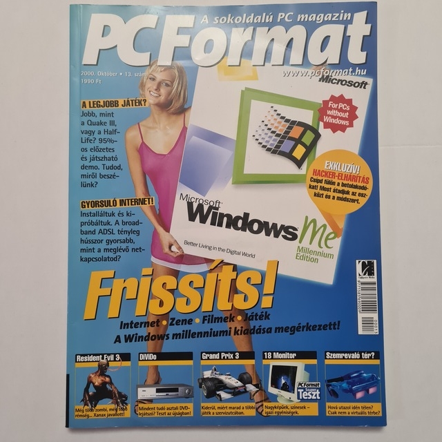A képen egy "PC Format" nevű magazin látható, ami a számítógépek és informatika világával foglalkozik. Ez a magazin elsősorban számítástechnikai híreket, cikkeket, termékteszteket és hasznos tippeket tartalmaz, amelyek az operációs rendszerekkel, szoftverekkel, hardverekkel és egyéb technológiai témákkal kapcsolatosak. A borító alapján az adott kiadás kiemelt témája a "Microsoft Windows Me", ami a Windows Millennium Edition rövidítése, egy olyan operációs rendszer, amelyet a Microsoft fejlesztett ki a fogyasztói piac számára. Megjegyzendő, hogy a Windows Me nem volt hosszú ideig a piacon, és vegyes kritikákat kapott a stabilitásával és teljesítményével kapcsolatban. A magazin további témái közé tartoznak a "Resident Evil 3" (egy népszerű videójáték), DVD technológia, "Grand Prix 3" (egy szimulációs versenyjáték), valamint "18 Monteller" ami valószínűleg egy termék vagy szolgáltatás tesztjét jelöli, de ennek pontos jelentése nem egyértelmű a kontextus hiányában. Az újság dátuma is látható, 2000. október 13., ami segít elhelyezni ezt a kiadványt időben. Az újságot azok számára tervezték, akik érdeklődnek a PC világának friss hírei és új fejlesztései iránt. [5.8]