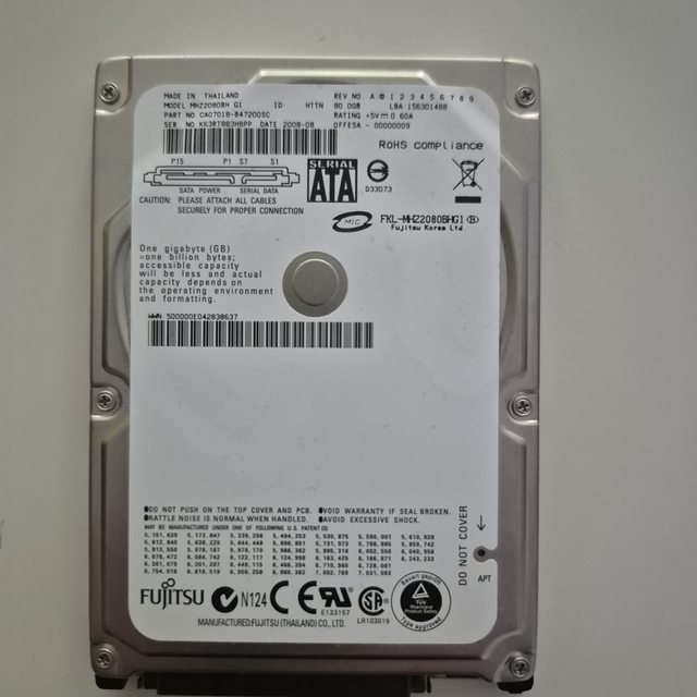 Ez a fényképeken látható termék egy Fujitsu gyártmányú merevlemez. A termék adatainak alapján egy HM-M2200BH modellel van dolgunk, amelyet Thaiföldön gyártottak. A merevlemez sorozatszáma A2D1T7625RFM, kapacitása pedig 80 GB, ami ideális kisebb adatmennyiségek tárolására. Az eszköz SATA csatlakozással rendelkezik, ami biztosítja a gyors és megbízható adatátvitelt. A merevlemez házán található címke figyelmeztetéseket is tartalmaz a felső borítás eltávolításának veszélyeire, mivel ez károsíthatja az eszközt. Az eszköz meghibásodása esetén a garancia a sérülés mértéke alapján érvényteleníthető. A termék megfelel a RoHS irányelveknek, ami környezetbarát gyártási folyamatot és anyagokat jelent. A második képen a merevlemez alja látható, amely magában foglalja az elektronikus áramköröket. Az áramkörök bonyolult hálózata gondoskodik az adatok gyors és pontos feldolgozásáról. A NYÁK lapka közepén egy címke található, amely további gyártási részleteket tartalmaz, például a gyártási helyet és dátumot. Összefoglalva, ez a merevlemez egy megbízható választás azok számára, akik kisebb, de gyors és hatékony tárolási megoldásra vágynak, miközben biztosak lehetnek abban, hogy a termék környezettudatos eljárásokkal készült. [2.8]