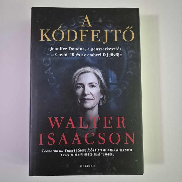 A képen egy könyv borítója látható. A könyv címe "A kódfejtő", amely központi témája a génszerkesztés és annak jövője, különös tekintettel a COVID-19 pandémiára és az emberi fajra gyakorolt hatásaira. Az írója Walter Isaacson, egy elismert szerző, aki korábbi életrajzi műveiről, mint például Leonardo da Vinci és Steve Jobs életeiről szóló könyveiről is ismert. A könyv borítóján egy nő arcképe is megjelenik, valószínűleg Jennifer Doudna, aki a génszerkesztés terén elért eredményei miatt vált híressé. A borítón az ő neve is szerepel, jelezve, hogy ő jelentős szereplője a könyv történetének. A könyv kiadója a Helikon, ami a borító alján található. A hátsó háttérben sejtelmes, molekulákra vagy DNS-láncra emlékeztető motívumok jelennek meg, utalva a génszerkesztés témájára. A szerző neve, Walter Isaacson, feltűnően nagy betűkkel szerepel a borítón, míg a főcím és alcím kicsit kisebb, de kiemelt módon van jelen. Ez a könyv azoknak szól, akik érdeklődnek a tudományos felfedezések iránt, különösen a mai biotechnológia és génszerkesztés terén elért áttörések iránt. Isaacson ismét mélyrehatóan és részletgazdagon mutatja be egy kiemelkedő személyiség és tudományos munka történetét. [2.6]