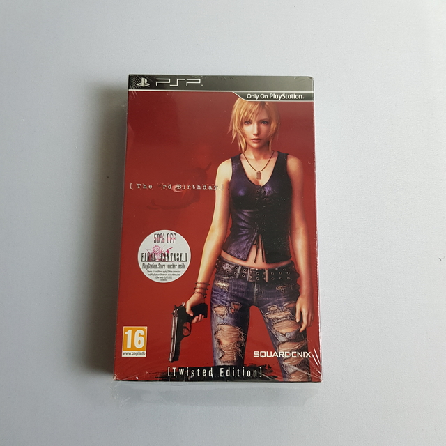 A képen egy PSP (PlayStation Portable) játék található, melynek címe "The 3rd Birthday". A borítón egy fiatal női karakter látható, aki farmernadrágot és fekete ujjatlan felsőt visel, kezében egy fegyvert tart. A játék Twisted Edition változata látható, amely a játék különleges kiadása. A borítón elhelyezett matricák információkat adnak a különféle ajánlatokról és korhatárról. Az alsó sarokban egy 16+ jelzés látható, ami azt sugallja, hogy a játék tartalma felnőttek számára készült. A játékot a Square Enix fejlesztette és adta ki, amely híres a magas minőségű, történetközpontú játékaikról. A borítón látható karakter erős, harcias megjelenése akciódús játékmenetet sejtet. Exkluzivitását az "Only on PlayStation" felirat is alátámasztja, ami azt jelzi, hogy ez a játék kizárólag PlayStation platformra érhető el. Az összességében sötét tónusú, de figyelemfelkeltő borító biztosítja, hogy a "The 3rd Birthday" egy izgalmas és intenzív élményt kínál a játékosok számára, amely magával ragadó lesz minden akció és szerepjáték kedvelő számára. [2.1]