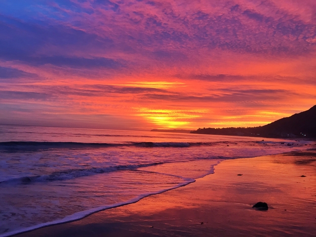 Ez a kép egy lenyűgöző naplementét ábrázol egy tengerparton. A képen látható természetes színjáték, amelyet a lemenő nap sugárzása és a felhőzet alkot. A lágy hullámok és a tengerpart homokja emeli ki a természet szépségét, miközben a képen látható színek gazdag palettája a narancstól, a lilán át, a rózsaszínig terjed. A termék, ha így tekintjük ezt a képet, egy természetesen adódó látvány, amelyet fotósok, turisták és természetkedvelők egyaránt értékelnek, és amely kiváló lehet inspirációként, pihenésre, vagy akár digitális háttérként is használható. A kép maga a csendesség és a békesség érzését közvetíti. [3.5]