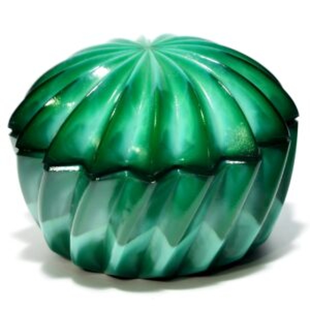Ez a lenyűgöző, zöld színű üvegdoboz elegáns megjelenésével azonnal magára vonja a figyelmet. A formatervezése egyedi, hullámzó mintázata a természet erejét idézi. A doboz tetejének harmonikus ívei gyengéden összetartanak, mintha egy virág vagy gyümölcs felszínét imitálná. Az anyag áttetsző felülete lehetővé teszi, hogy a fény játékosan megtörjön rajta, ezzel különleges fényjátékkal örvendeztetve meg a szemlélőt. Az üvegdoboz praktikus mérete lehetővé teszi, hogy kisebb értéktárgyakat vagy ékszereket tároljunk benne, ugyanakkor dísztárgyként is kiválóan megállja a helyét. Élénk zöld színe frissességet és életet visz bármilyen térbe, ahol elhelyezik. Méretei és formája révén tökéletesen illeszkedik a modern és klasszikus enteriőrökbe egyaránt. Ez a műtárgy nem csupán praktikus, hanem esztétikai élményt is nyújt, mely emeli a helyiség hangulatát. Az üveg anyagának finom kidolgozottsága a minőségi mesteremberek munkáját dicséri, ezáltal a doboz hosszú ideig megőrzi szépségét és funkcionalitását. [1.5]
