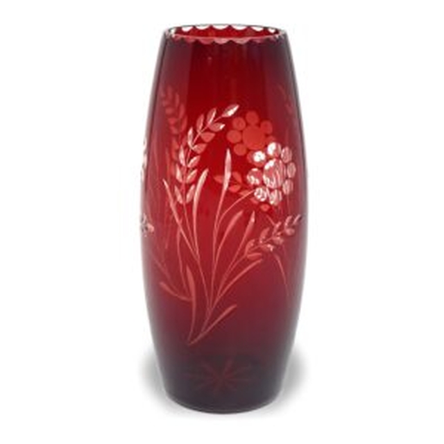 kw: vörös kristályváza, elegáns váza, kézi gravírozás, dísztárgy, otthoni dekoráció, virágváza, műalkotás