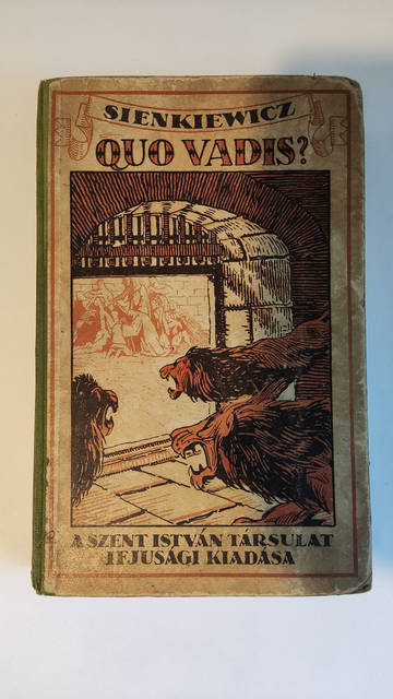 A bemutatott könyv „Quo Vadis?” címmel egy klasszikus irodalmi mű, amelyet Henryk Sienkiewicz írt. A borító színvilága és grafikai elemei az antik Róma világát idézik meg, összhangban a történet történelmi hátterével. Az élénk, részletesen kidolgozott illusztráción oroszlánokat láthatunk, amelyek egy arénát szimbolizálnak, utalva a regény egyik kulcsjelenetére. Az illusztráció fölött a szerző neve kiemelt helyen szerepel, míg a cím központi pozícióban helyezkedik el, egy klasszikus stílusú betűtípussal. A könyv borítóján található az alcím: "A Szent István Társulat Ifjúsági Kiadása", ami arra utal, hogy ez a különleges kiadás a fiatal olvasóközönség számára készült. Ez a kiadás valószínűleg a 20. század elején jelent meg, amikor az irodalmi klasszikusok ifjúsági adaptációi különösen népszerűek voltak. A borító zöld vászonkötésű, ami hangsúlyozza a könyv tradicionális és időtálló jellegét. A történet nagyszabású, tele van drámai fordulatokkal, és gazdag történelmi részletekkel, megragadva az olvasó figyelmét. Az ábrázolt képi világ nemcsak esztétikai értékű, hanem kiemeli a történet mélyebb, emberi és történelmi vonatkozásait is. [1.6]