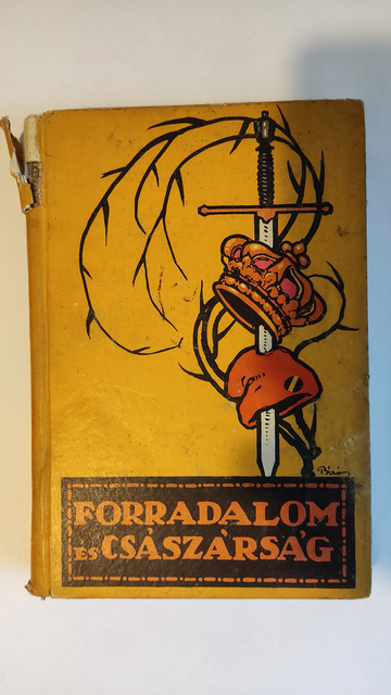 A könyv borítója sárga alapszínnel rendelkezik, amely azonnal magára vonja a figyelmet. A középpontban egy érdekes grafika látható: egy keresztbe tett kard felül hegyes végével, amelyre egy korona van ráhelyezve. A kard a koronával szimbolikus üzenetet hordozhat magában, utalva a forradalom és a császárság közötti feszültségre, összecsapásra. A háttérben néhány ívelt vonal mintegy árnyékként körvonalazza a központi motívumot, fokozva a vizuális hatást. A borító alsó részén, sötét háttérrel, kontrasztos betűkkel szerepel a könyv címe, "Forradalom és Császárság", kiemelve a tartalom lényegét és felkeltve az olvasó érdeklődését. Ez a cím izgalmasnak ígérkezik, sugallva a történelmi konfliktusok és hatalmi harcok világát. A borító jobb felső sarkán kisebb sérülés látható, ami a könyv korára vagy használtságára utalhat. Összességében a borító egy történelmi és politikai témájú művet ígér, amely a vizuális elemek révén azonnal megragadja a potenciális olvasók figyelmét, felidézve a múlt jelentős eseményeit. [1.7]