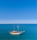 A képen egy vitorlás hajót látunk a nyílt tengeren. Ez a hajó típusa lehet egy klasszikus kétárbocos vitorlás, ami alkalmas lehet tengeri kirándulásokra, személyszállításra, vagy akár céges rendezvényekre is. A képen nem látszódnak jelzések vagy feliratok, amelyek alapján pontosabb információt adhatnék a hajó márkájáról vagy típusáról. A hajón utasokat látunk, ami arra utalhat, hogy a hajó turisztikai célú kirándulásokat végez. Fontos megjegyezni, hogy egy ilyen hajó üzemeltetése magában foglalhatja a hajós személyzet biztosítását, biztonsági felszerelést, és különleges engedélyeket tengeri utazásokhoz. Egy ilyen hajó élményt, kikapcsolódást és különleges tájképeket nyújt az utasoknak, miközben a tengeri környezetet élvezhetik. [4.2]