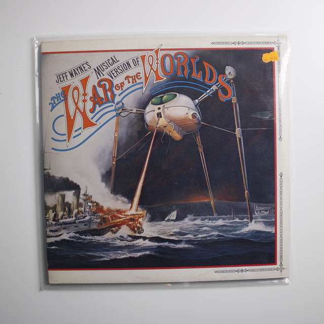 Ezen a képen egy bakelitlemez látható, amit általában csak "vinyl" vagy "LP" (long play) néven ismerünk. A lemez a "Jeff Wayne's Musical Version of The War of the Worlds" című albumot ábrázolja, ami egy rockopera, és H. G. Wells híres "A világok harca" című sci-fi regényének zenés adaptációját tartalmazza. Jeff Wayne angol zeneszerző, zenei producer műve, és ez a mű az egyik legismertebb szabadszavaltatos zenés adaptációja a történetnek. A borítón lévő művészi ábrázolás egy jellegzetes jelenetet mutat be a regényből, ahol a marsi hódítók tripód harci gépei támadják a Földet. A design retro-sci-fi stílusban készült, ami tükrözi a regény és az album kiadásának korát is. Az albumot először 1978-ban adták ki, és a borítón látható ár és címkék alapján úgy tűnik, hogy ez egy korábbi kiadású példány lehet, ami gyűjtők számára értékes lehet. Az album különlegessége, hogy nemcsak egy sima zenei anyag, hanem egy összetett naratív élményt nyújt, amely több színészt és énekest is felvonultat, és a kellemesen dramatizált történetmesélést a zenével ötvözi. Az albumon a rock és a progresszív rock elemei dominálnak, és olyan technikai innovációkat is tartalmaz, mint a szintetizátorok és különleges hanghatások használata.