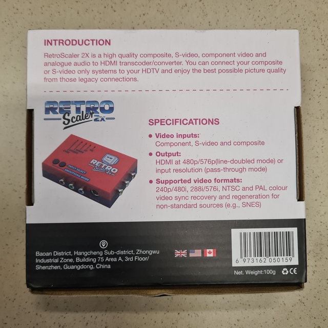 A képen egy RetroScaler2X A/V Converter and RetroScaler2X terméket látsz. Ez egy videó átalakító eszköz, amelyet a régi videojáték-konzolok és hasonló analóg videóeszközök modern, HDMI-képes TV-kkel vagy monitorokkal való összekapcsolására terveztek. A konverter lehetővé teszi, hogy a kompozit video, S-video és komponens video jeleket átalakítsa HDMI formátumra, így javítva a képminőséget a modern kijelzőkön. A csomagolás a következő specifikációkat sorolja fel: - Videó bemenetek: Kompozit (pass-through módban), S-video és komponens videó. - Kimeneti felbontás: HDMI 720p. - Támogatott videó formátumok: 240p/480i standard felbontás NTSC és PAL, beleértve a régebbi videojáték-konzolokat is. - A csomagoláson feltüntetett vonalkódból és jelölésekből kiderül, hogy a terméket Kínában gyártották. A termék csomagolása tipikus retro stílusban készült, amely illeszkedik ahhoz a korszakhoz, amikor a gyártott videojáték-konzolok készültek. A termék maga egy kis, piros téglalap alakú doboz, több csatlakozóval elől és hátul, hogy megkönnyítse a régi eszközök modern TV-hez csatlakoztatását. A "Retro Scaler" neve és a pixeles televízió ikonja az eszköz videogaming kapcsolatát szimbolizálja.